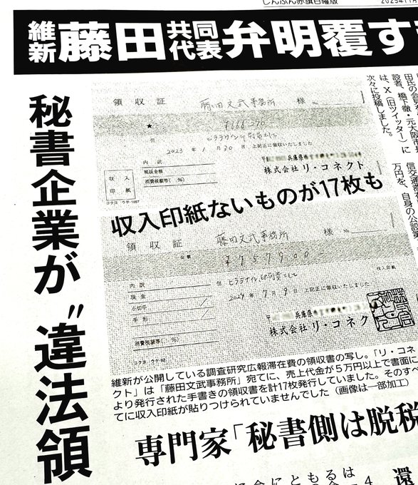 維新・藤田共同代表の税金ロンダリング疑惑に新証拠! 公金2千万円を受けとった秘書企業の領収書 うち17枚には収入印紙が貼ってなかった! コレ、印紙税法違反の可能性アリ 衝撃の事実を赤旗記者が突き止めた…