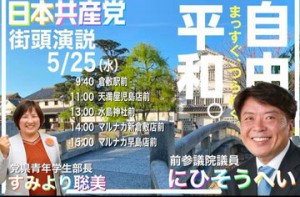 いよいよ参院選公示日(予定)までちょうど一カ月。明日から3日間は広島&岡山で #にひそうへい 中国地方キャラバン! 24日広島市、25日倉敷市、26日岡山市。お近くの場所にぜひ直接うったえを聞きにおこしください。各時間と箇所はバナーを参照。 #被害あるかぎり絶対あきらめない #日本共産党