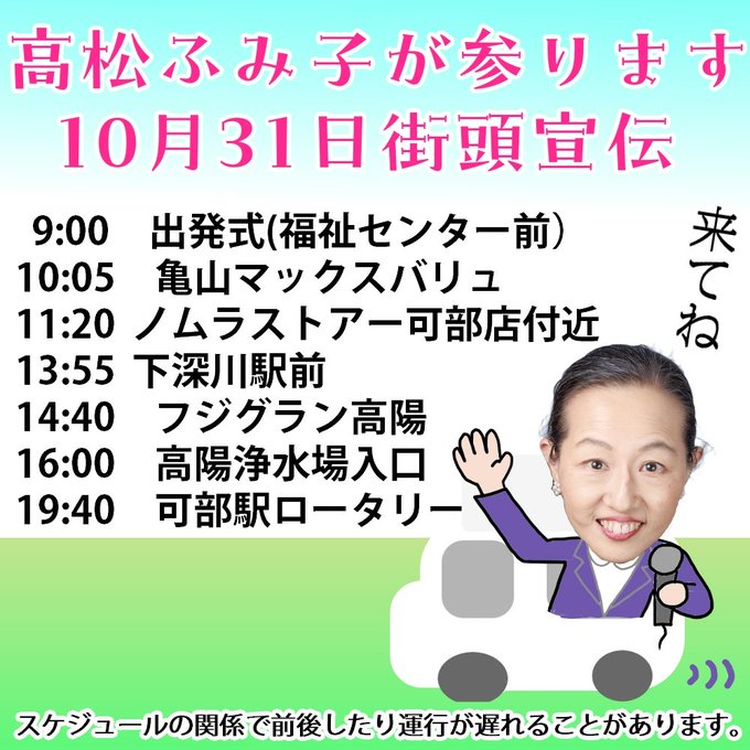 本日10月31日はいよいよ広島県議補選の告示日です。 10月31日(金)の高松ふみ子の宣伝場所をご案内します。 9:00出発式(福祉センター前) 10:05 亀山マックスバリュ 11:20 ノムラスト…